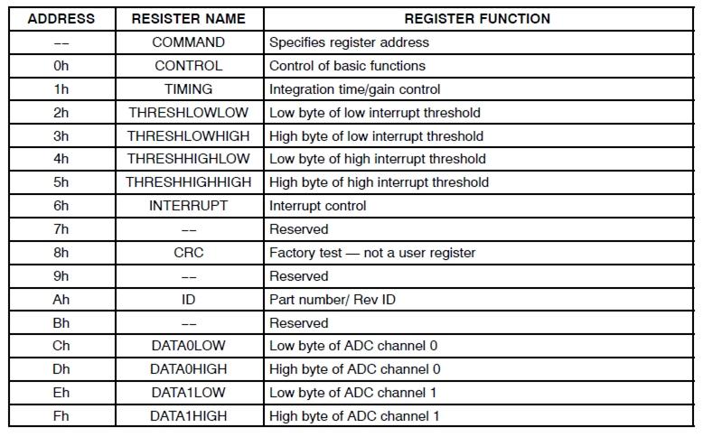 The TSL2561 is controlled and monitored by sixteen registers (three are reserved) and a command register accessed through the serial interface. These registers provide for a variety of control functions and can be read to determine results of the ADC conversions. The register set is summarised as shown below.