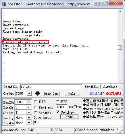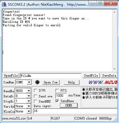 Select the "SendNew" option. Send the ID # you want to use. You can use up to 162 ID numbers. And it will ask you to press the finger to the sensor. At the moment, you should see the red LED blink.