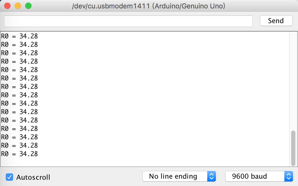 Adjust the resistance of R1(the blue potentiometer) with a small screwer to make the number of R0 in the range of 10-100 and record that number(my R0 number here is 34.28).